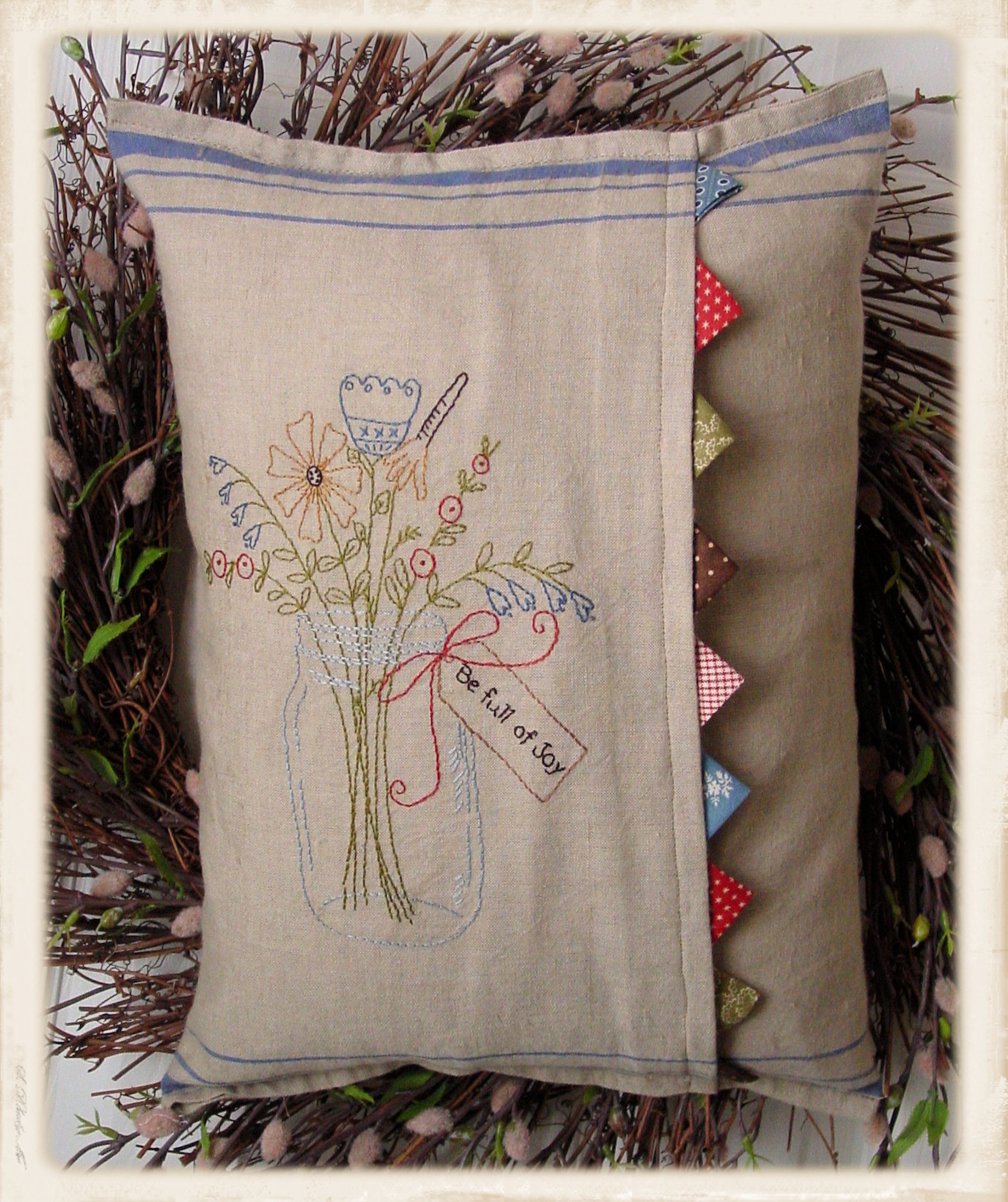 A sweet stitched 12 X 16 pillow. Third in a series of four. This project combines embroidery & prairie points to create a delightful pillow.