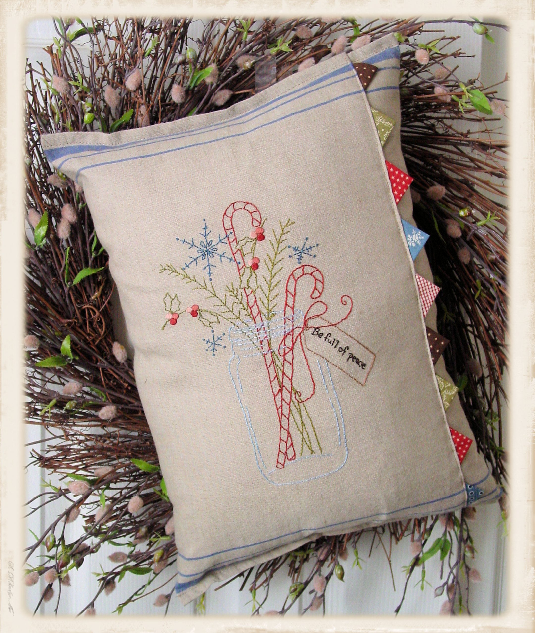 A sweet stitched 12 X 16 pillow. First in a series of four. This project combines embroidery & prairie points to create a delightful pillow.