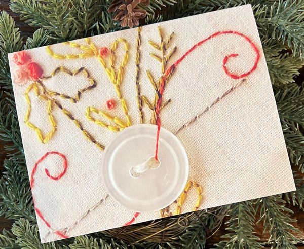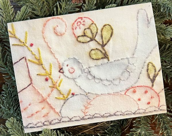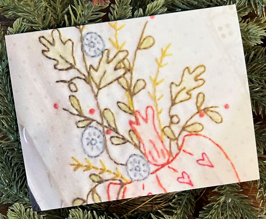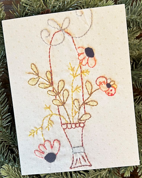 Four blank notecards with sweet stitcheries pictured on the front. Includes envelopes and the pattern to stitch the delicate little basket.