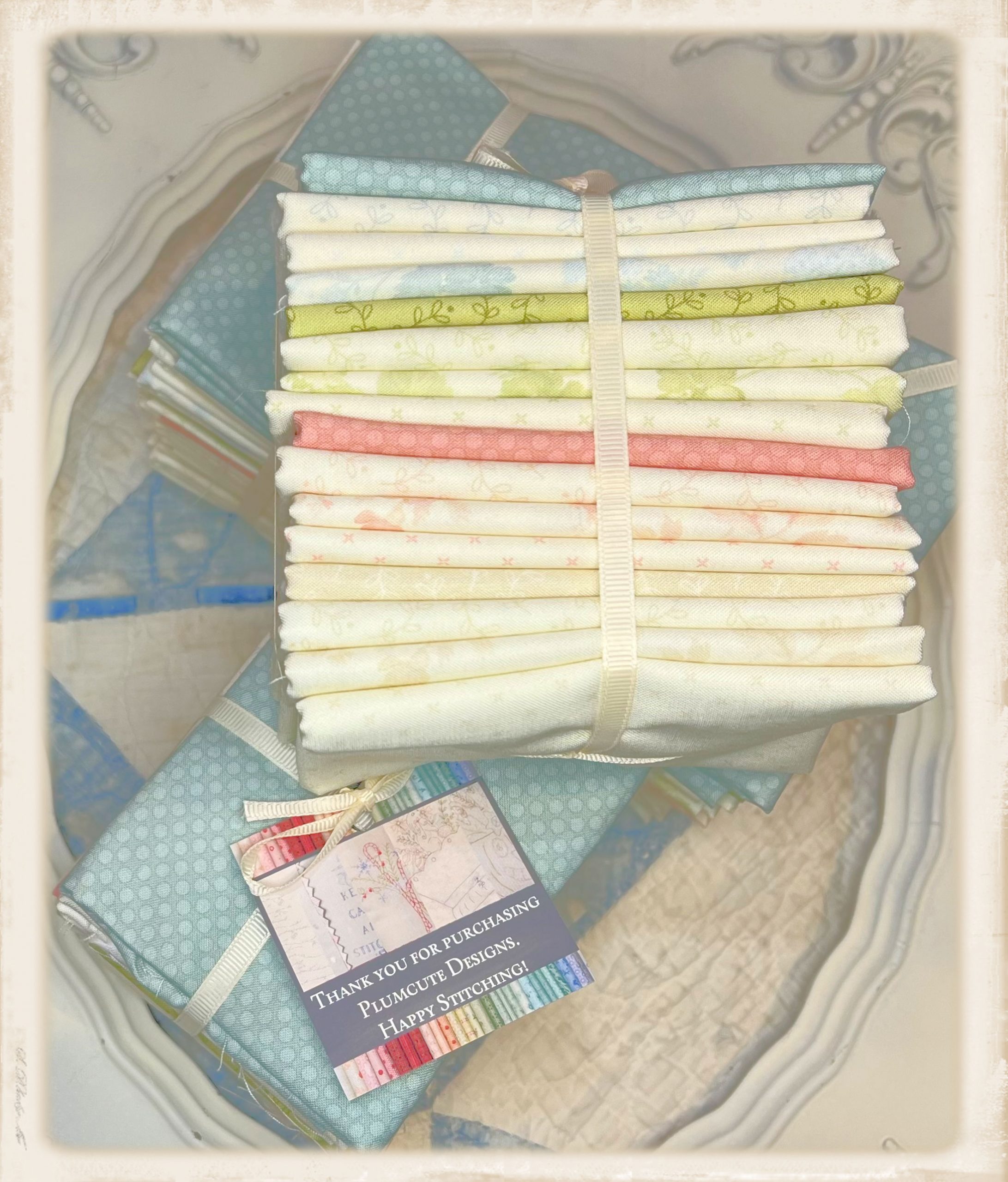 Sixteen fat quarters of soft, delicate, Plumcute Designs prints. Manufactured by Marcus Fabrics. Beautiful for stitchery and piecework.