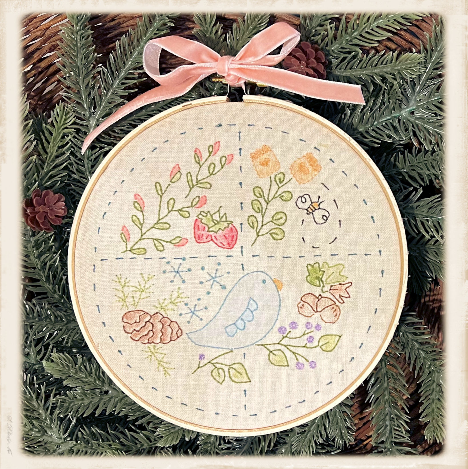Sweet seasons stitched into the hoop and finished with some colored embellishment and a bow. Simple stitches make this a delightful project for any level stitcher.